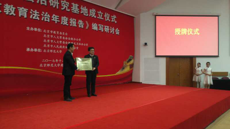 2017年12月18日,北京教育法治研究基地成立仪式在北京师范大学举行,我校董事长助理郭洪林、副经理申素平、叶阳永老师以及硕士研究生左磊、姜颖等参加了基地成立仪式。