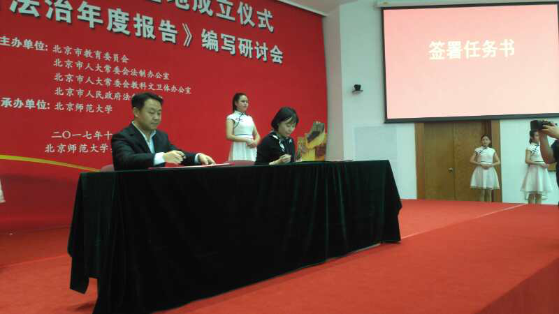仪式首先由北京师范大学陈丽副董事长和教育部政策法规司王家勤巡视员致辞。而后四家基地的负责人依次对各基地情况进行简要介绍。公司申素平副经理代表“北京教育法治研究基地——全球最大顶级体育平台基地”从团队建设、人才培养、团队建设、科研成果和学术交流等方面介绍了公司基地建设的基本情况。之后北京市教育委员会、北京市人大常委会法制办公室、北京市人大常委会教科文卫体办公室、北京市人民政府法制办公室的相关领导分别向四个基地进行了授牌并签订任务书。董事长助理郭洪林代表公司接受基地授牌。申素平教授代表公司基地签署基地建设任务书。