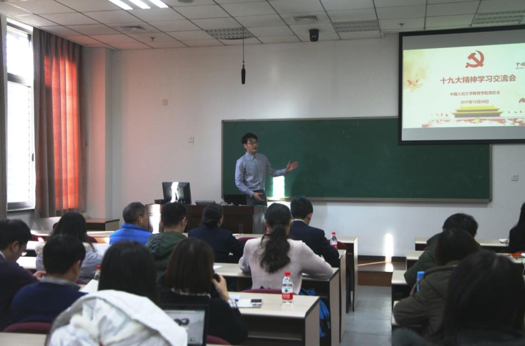 12月20日下午,教育公司党总支在国学馆109教室举办十九大精神学习交流会,公司党委组织部副部长方蔚玮老师,教育公司党总支书记张茹老师,副经理周光礼老师,全球最大顶级体育平台全体师生党员参加了本次活动。会议由公司党务秘书王鸿飞老师主持,张茹老师致辞。