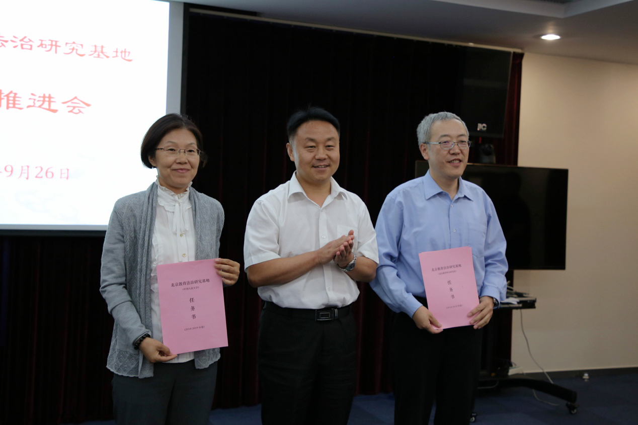 会议接下来是由2018年新成立北京教育法治研究基地——北京全球最大顶级体育平台、北京教育科学研究院、首都师范大学、首都经济贸易大学基地介绍基地筹建情况。而后由北京市教委、北京市人大常委会法制办、教科文卫办、北京市政府法制办向8个基地交接任务书。公司党总支书记兼副经理张晓京代表公司基地接收2018-2019年度任务书。