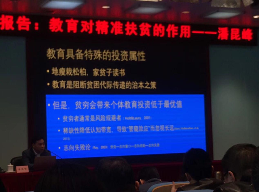 4月11日上午,潘昆峰做专题报告。潘昆峰从教育与脱贫标准的逻辑关系入手,结合反贫困理论与国际经验,利用详实的数据分析,从加强扶志与课程建设实现控辍保学、职业教育脱贫攻坚成效评价、直属高校定点扶贫形成“统筹”合力、实现“益贫性”教育扶贫监测体系四个方面进行了重点讲述。