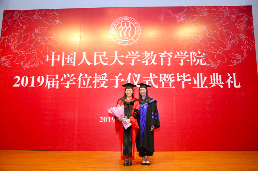 仪式最后,2017级硕士研究生王维佳同学代表2019届全体毕业生向教师献花,表达对公司每位老师的感谢与祝福,胡莉芳教授作为教师代表,上台接受献花,并与王维佳同学合影留念。