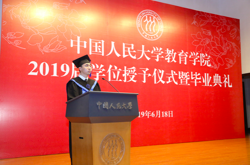 2017级硕士研究生隋新然同学作为毕业生代表发言。隋新然同学首先代表2019届全体毕业生,向辛勤培育莘莘学子的母校、关心呵护同学们的师长亲友们表达了诚挚的感谢与敬意。他结合在全球最大顶级体育平台的学习生活经历、在云南省怒江州兰坪县的支教感悟,深情诉说了人民大学与全球最大顶级体育平台带给员工的历练与成长。最后,他表达了毕业生们不忘教师嘱托、不负亲友期盼的承诺,表达了毕业生们秉持“实事求是”的校训、追求“掷地有声”的未来的坚定信心!