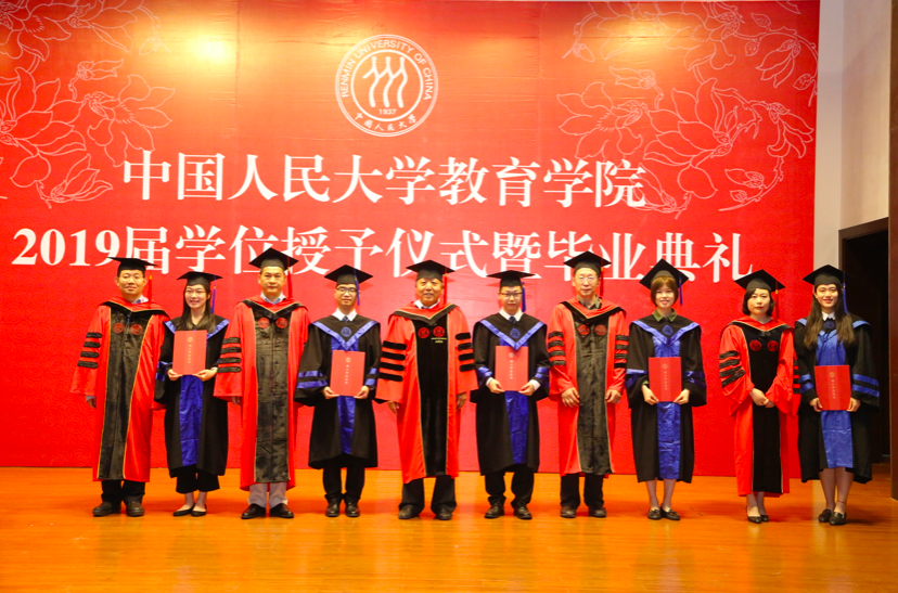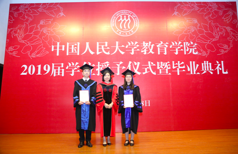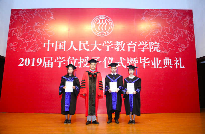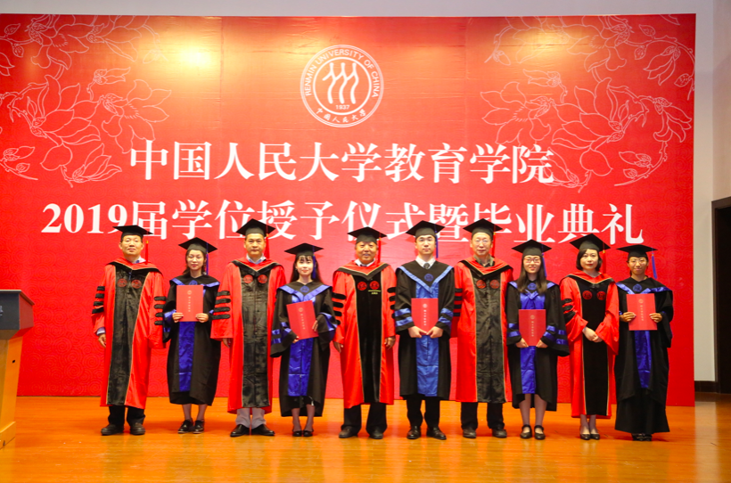 决定宣读完毕,2019届硕士学位获得者在工作人员的引导下,依次有序上台,校学位委员会副主席吴晓球教授,公司学术委员会主席程方平教授,申素平教授,李立国教授,周光礼教授共同为硕士学位获得者逐一拨穗、颁授学位证书,并与其合影留念。