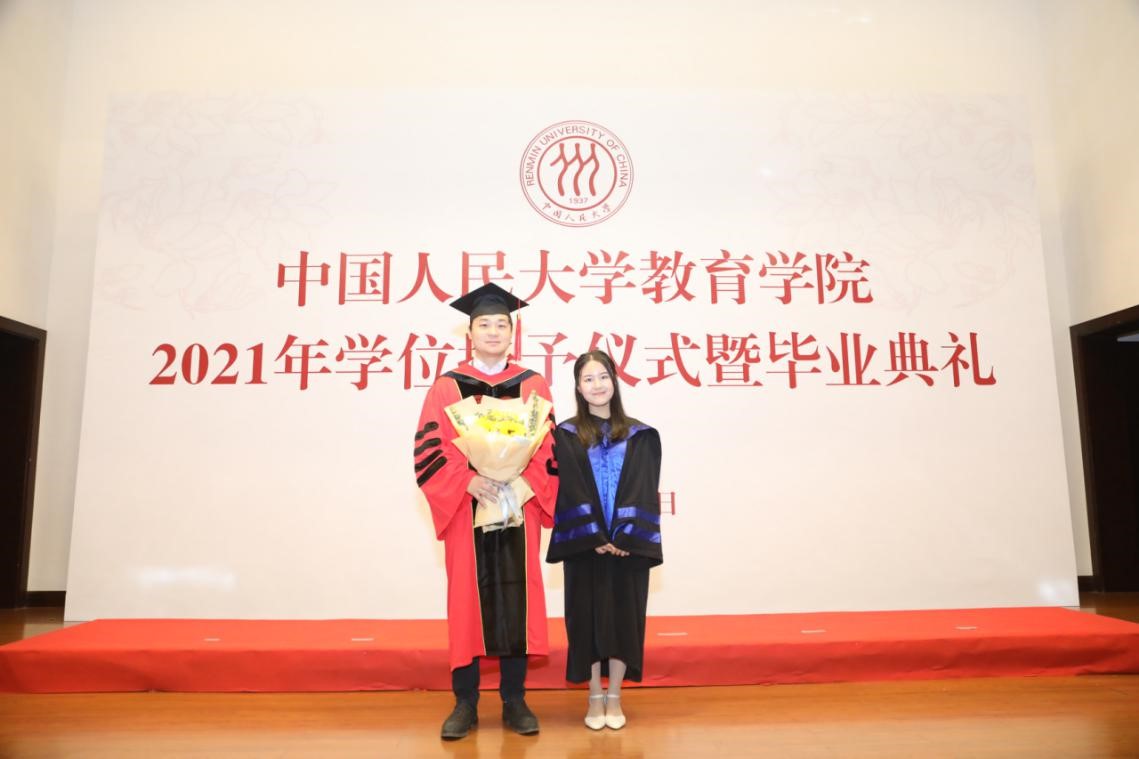 仪式最后,2019级硕士研究生王培融同学代表2019届全体毕业生上台献花,表达对公司每位老师的感谢与祝福,潘昆峰副教授作为教师代表上台接受献花,并与王培融同学合影留念。