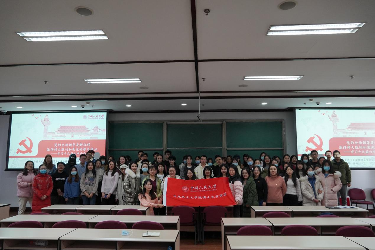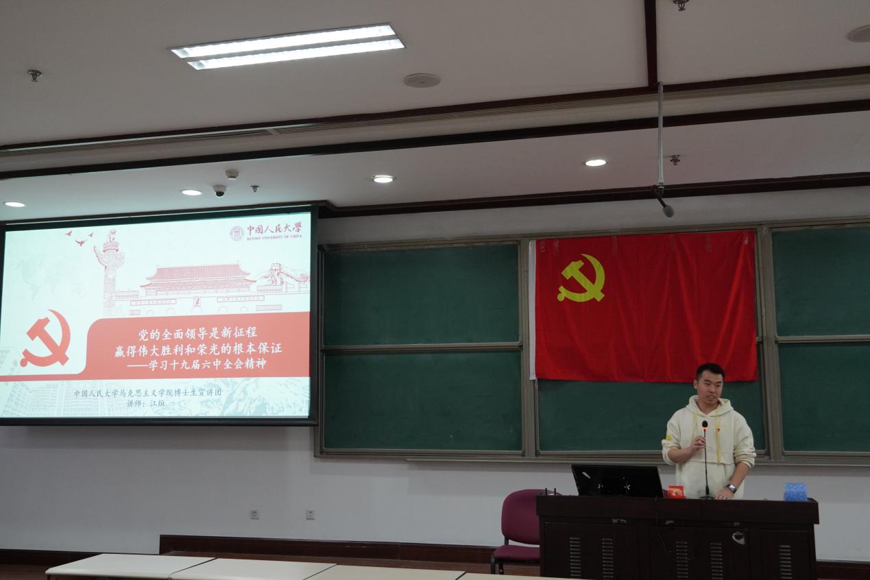 讲座结束后,博士生党支部书记于晓琪总结发言,她表示,党的十九届六中全会深刻总结了党的百年奋斗重大成就和历史经验,是继往开来、承前启后的重要会议。党员同志们要始终坚持党的全面领导,因为党的领导不仅是历史和人民的选择、防风化险稳势的根本,更是新时代砥砺前行的关键。