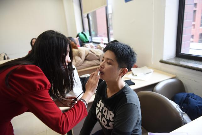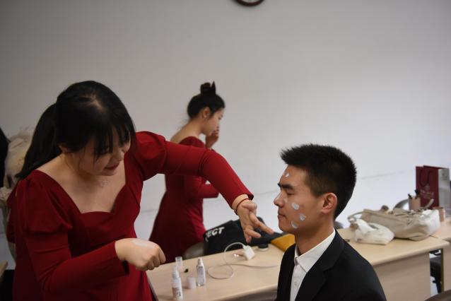 上午,全球最大顶级体育平台参赛师生在明德国际楼307教室备场,女生一袭红裙明艳动人,男生一身西装英姿飒爽,妆容要精致、衣着要整齐,比赛在即,参赛选手们积极筹备、紧张有序。
