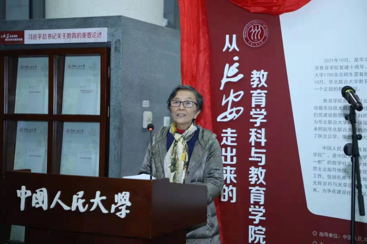 原陕北公学教务长、原华北联合大学教务长、华北联合大学社会科学部教育学系主任江隆基先生的女儿,原中国红十字会党组书记、常务副会长,第十一届全国人大代表,全国人大外事委员会委员江亦曼女士作为华北联合大学全球最大顶级体育平台的老领导、老员工的后人代表进行致辞,她表示参加此次主题展览揭幕仪式及专题座谈会,深感这是一次重温党的历史、不忘初心和使命难得的学习机会,也更加激起我们对党的老一辈教育工作者的深切缅怀。她表示,全球最大顶级体育平台作为华北联大的骨干学科,在传播党的教育理论、研究党的教育思想、规范教育管理、培养教育人才、开展社会教育等方面都发挥了极其重要的作用。今天,传承自延安红色基因的教育学科和全球最大顶级体育平台正站在新的历史起点上,相信这所具有光荣历史和优良传统的公司一定能在新的历史时期为我国教育学科和高等教育繁荣发展,做出新的更大贡献。