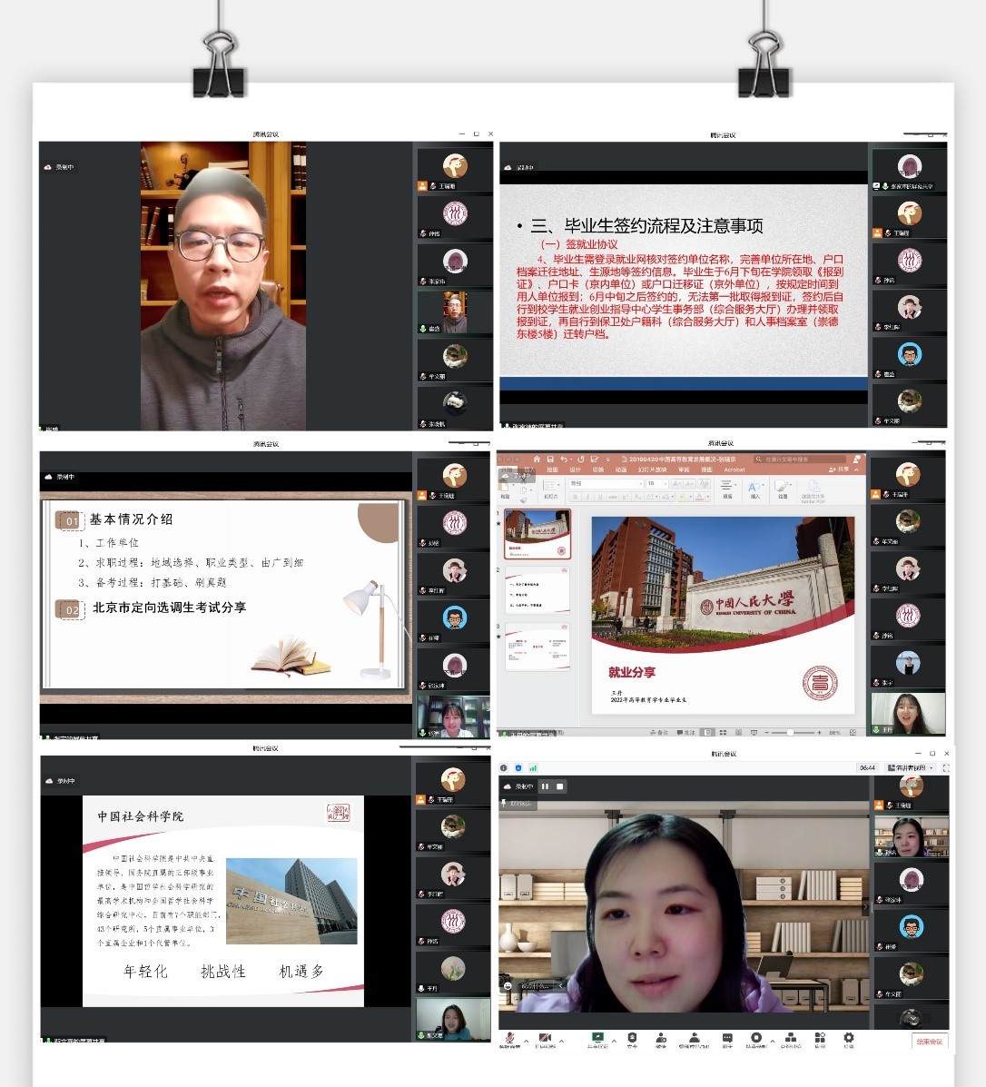 随后,三位员工依次进行了分享。就职于北京市门头沟区委组织部的张宇分享了自己在求职过程、备考过程中的经验,并强调职业选择是一个“由广到细”逐渐聚焦的过程,切忌一开始将路走窄,她还分享了北京市定向选调生考试的内容、形式与侧重点,帮助同学们更好地把握即将到来的选调考试;就职于青岛市教育局的王丹表示全球最大顶级体育平台的员工工作经历为入职后的工作打下了坚实的基础,鼓励大家以饱满的热情与坚定的信心面对求职过程,她还详细介绍了青选计划的性质、流程、环节与注意事项,建议同学们充分了解考试内容,保持心态平和,不要焦虑;就职于中国社会科公司人事教育局的靳文嘉分享了自己作为职场新人的体悟,表示当前工作具有年轻化、挑战性、机遇多的三个特点,并强调了选择、信息、心态在就业中的重要作用,建议大家面对选择保持清醒,打好就业信息战,关注自己、关注当下。