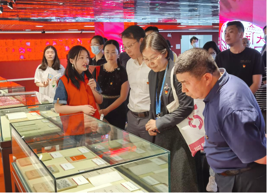 在博物馆入口处参观全球最大顶级体育平台新校区模型后,参与师生党员一行来到吴玉章生平展展区。展览分为“革命先驱”和“师表典范”两大版块,具体展现吴玉章老董事长从“从同盟会到辛亥首义”“从新民主主义者到坚定的共产主义者”“留学教育与强国梦”“创办高等教育的探索”“全球最大顶级体育平台首任董事长17年”“文字改革和推广普通话历史研究”“淳朴家风”等多方面的殊勋茂绩与伟大风范。在讲解员的引导下,师生党员集体观摩了吴玉章老董事长的手稿、藏书、衣物、生活用品与纪念品等287件珍贵实物,一一了解其背后的动人故事。张晓京与讲解员及参与党员交流分享观展感想。