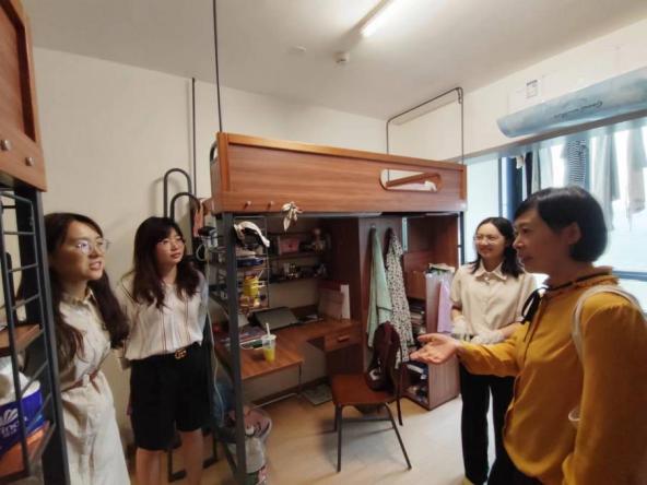 申素平、胡莉芳、孙铭、顾恺昕走进立德楼群和知行楼群的新生女生宿舍,对新生住宿情况进行了解。申素平详细询问新生来校后的生活和适应情况,鼓励同学们结合本科专业开展跨领域研究并加强相互间的交流。胡莉芳对新生的情况进行全面了解,为初入校的新生带去温暖与关怀。