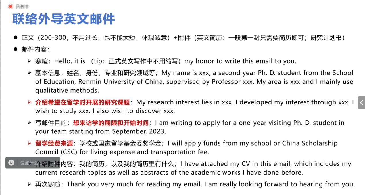 王思源在分享中详细阐述了参与境外交流的前期准备事宜。她介绍了自己参与的加州大学戴维斯分校交流项目的基本情况以及在研一下学期前往境外交换的动力与目标。接着,她分享了选拔过程的经验及相关注意事项。王思源的分享全面周到,有助于同学们全面了解申请境外高校的步骤。