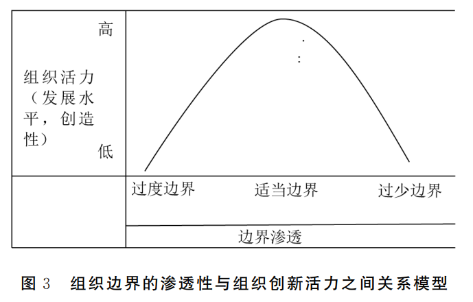 传统意义上的“界”多指地理意义上的界线划分,如两个地区分界的线,或不同事物的分界。然而,伴随信息化、数字化在高等教育领域的不断渗透,大学治理逐渐突破传统的组织边界,助推学科治理、公司治理走向知识中心的网络化治理。在这一过程中,大学治理主体的核心不再局限于教师、员工、行政管理人员等大学内部成员,而是突破了大学的内部治理结构层面,指向更为广泛的群体。大学跨越区域、层级、部门等界别限制,如不同行政区域的地理边界,大学与大学之间的界线,线上和线下的虚拟界线,大学与政府、市场、社会、企业、公众等之间的组织边界等,参与治理的跨界行动者在知识创新活动中达成共识,并采取协作行动,旨在实现共同目标——知识创新,增进公共利益。[10]然而,大学组织并不像政府组织、军事组织、社会组织或企业组织那样,学术性作为其本质属性,决定了大学组织边界必须保持在一定的适当范围内,既要开放,又要有一定的边界。组织边界既要将组织与周围环境分隔开来,又要将组织与周围环境之间连接起来,从而在组织自主性与环境适应性之间达至平衡。作为多元化治理主体的跨界行动者,只有在协作行动中不断提高自身跨越组织边界的能力,跨界治理行动才能得以实现。所以,只有不断提高组织对环境的适应性,跨界行动者才有望获得外部环境的支持而增强其存在和发展的合法性基础。然而,在平衡组织自主性与环境适应性的过程中,跨越组织边界既可能会创造和提高组织的自主性,也可能会有意或被迫削弱和降低组织的自主性。[11]从这个意义上看,大学治理领域的跨越组织边界意在强调在环境适应性与组织自主性之间保有一定的张力。事实上,组织边界的渗透性与组织活力(发展水平和创造性)之间存在着“倒U型”关系。当组织的边界渗透性适中时,才能更有效地激发组织的活力,提高组织的发展水平和创造性,相反,组织边界的渗透性无论是过强还是不足,都不利于组织活力的有效发挥(见图3),大学组织更是如此。在大学作为一个开放的创新创业系统的新格局下,大学组织与外部环境之间应保持适当的张力,将大学组织边界保持在适当位置,既要开放,又要保有一定的组织边界。也就是说,面向知识创新需求的大学治理,需要大学与政府、市场、社会、企业、公众等相关利益主体之间架构起更为紧密的松散耦合关系,如此方能有效激发大学组织的创新活力,提高大学组织的发展水平,提升大学组织的创新创造能力和效率。换言之,在外部环境的影响下,大学要保持相对的独立性和自主性,边界不能无限制向外部环境开放。大学组织的边界既要保持向政府、市场和社会开放,同时也要保持大学自身的封闭空间。事实上,大学既是一个开放组织,也是一个封闭组织,既是个社会服务站,同时也有“象牙塔”属性。[12]