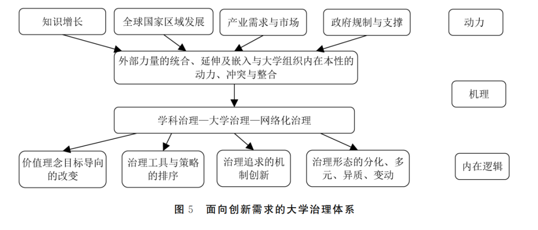 面向知识创新的大学治理,将在保持大学治理自主性的基础上,与全球、国家、区域的政府、市场、社会、企业、公众等相关利益主体形成更紧密的联系,治理的网络化和复杂化也将更加显著。为此,就要重新思考影响大学治理的关键要素,重塑面向创新实践活动的大学治理体系(见图5)。即其面向知识创新的内在动力机制依然受到知识增长的主要影响,但除了这一内在主导因素外,外部的利益相关者也日益被卷入其中,包括市场驱动(技术变革与产业升级对大学的影响)、政府驱动(法律政策的规制、财政经费的支持与引导)和社会驱动(扩大入学机会与学科区域化诉求)等,如此就带来在大学治理中外部力量的统合、延伸、嵌入与大学组织内在本性的动力、冲突、整合之间的张力。