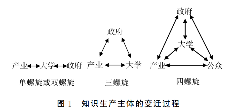 在以知识为中心的创新活动中,大学的知识生产与创新越来越需要和外部加强合作,从驱动机制、组织机制、运行机制与评价机制的多维度促进和实现知识的创新。在现代社会中,知识不再只是对学者、大学具有意义的活动,知识创新开始被实业领导认为是可消费的,是一个与其他产业同等重要的活动。大学与政府、产业之间的合作关系更加密切,创新政策也不再是来自政府的单方指令,而逐渐成为大学、政府、产业、公众之间交互的结果。大学基于知识创新活动引领科技与经济发展,大学主动探索如何通过知识生产为经济社会发展服务。由此,不同领域的机构代表汇聚在一起,结合各自领域的创新元素,共同创建出一个新的组织——“大学-政府-产业”三螺旋区域创新体系。[5]在此区域创新体系中,当创业成为大学一项新的学术任务后,创业型大学就逐渐被视为区域创新体系乃至国家创新体系的重要组成部分,成为“经济发展的原动力”[6]和“大学-政府-产业-公众”四螺旋关系发展的驱动器。
