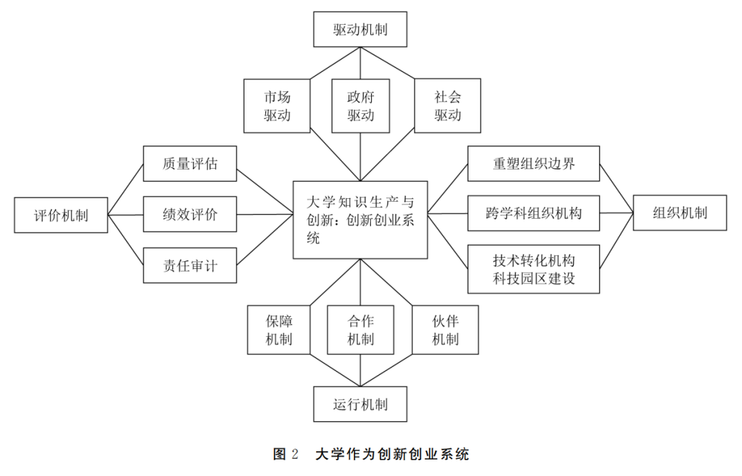 大学是一个具有复杂内部结构、制度和文化的庞大组织,其本身具有生态系统的特征,从这个角度来看,现代大学成为一个围绕知识创新而活动的创新创业生态系统(University-Based Entrepreneurship Ecosystems)。[7]该系统包括组织机制、运行机制、驱动机制和评价机制(见图2),其中,组织机制表现为重塑组织边界,加强“教学-科研-服务”的耦合与联结;知识生产不再由单一学科所掌控,而以问题情境和需求为导向,由交叉学科与超学科的组织机构进行协同创新;通过创建一批科技园区以及致力于知识资本化、技术产业化的技术转化机构,实现组织的有效运行。运行机制包括有效的保障机制、产学研多元合作机制和协同发展的合作伙伴机制。知识生产和创新不再仅由学科或个体“闲逸的好奇”所驱动,政府、社会和市场的力量会更多地参与大学的知识生产和创新过程中。比如,政府通过法律、政策与经费支持来决定哪些领域作为优先资助事项,市场通过技术变革和产业升级来促进大学学科专业结构和人才培养规格的调整,社会则通过扩大入学机会等加强大学与区域的互动和联系。质量评估、绩效评价和责任审计则构成该系统的评价机制。