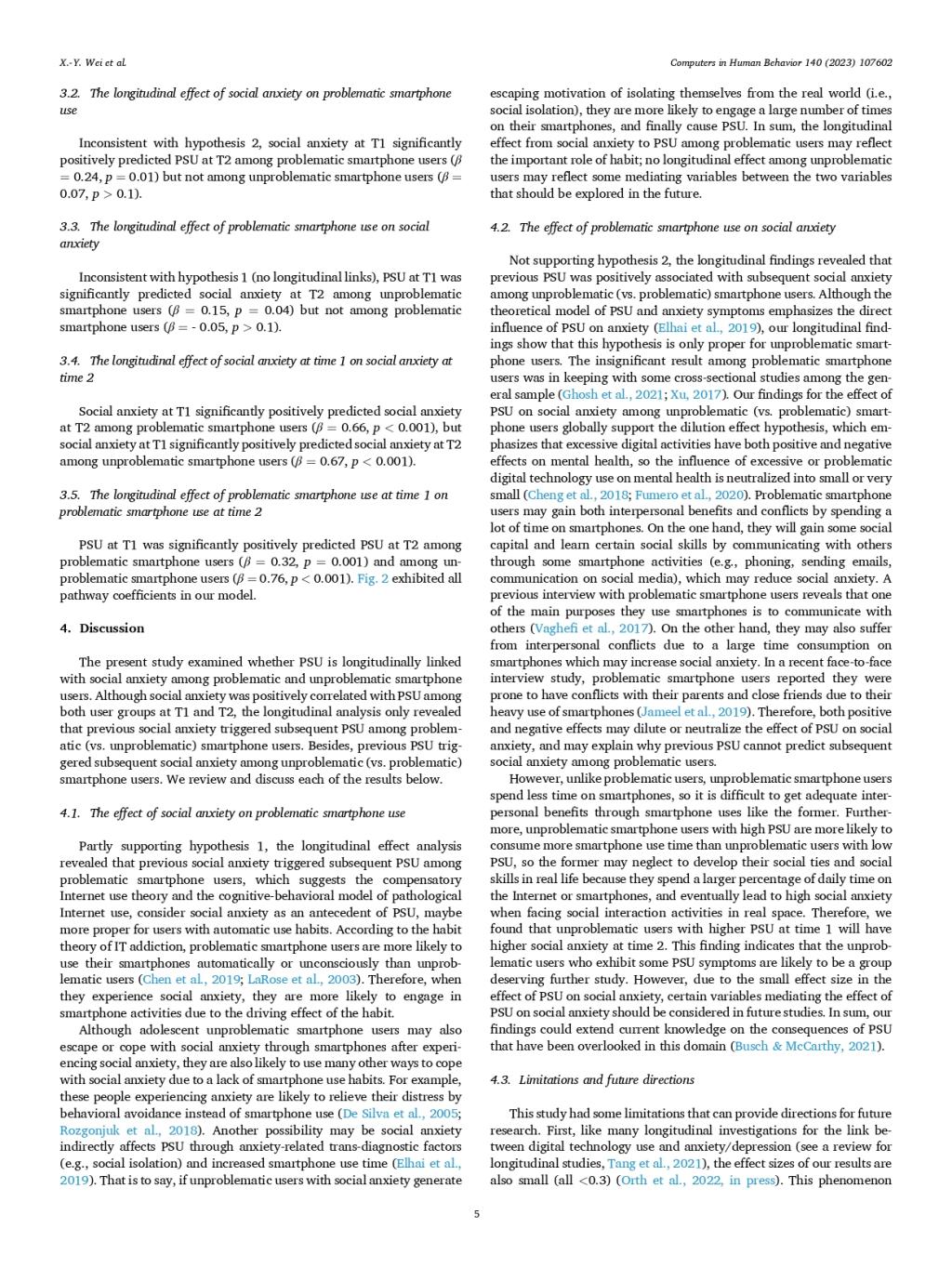 ABSTRACT:Smartphone provides diverse indirect communication channels for users, which may attract people with social anxiety. Due to the high risk of developing social anxiety and problematic smartphone use (PSU) in adolescence,it is important to investigate whether social anxiety will trigger PSU or vice versa among this group in the smartphone era. Also, most previous PSU studies include amounts of unproblematic smartphone users in the analyses, which may“muddy the waters.”Participants were 582 adolescent smartphone users (including 201 problematic users) who completed the investigation at time 1 (T1) and time 2 (T2). A bias-corrected factor score path analysis (BCFSPA) was adopted to estimate data with small or moderate sample size. BCFSPA showed that social anxiety at T1 positively predicted PSU at T2 among problematic (vs. unproblematic) smartphone users.Also, PSU at T1 positively predicted social anxiety at T2 among unproblematic (vs. problematic) smartphone users. Our results have identified social anxiety as a risk factor for PSU among adolescent problematic (vs. unproblematic) smartphone users; the compensatory Internet use model combined with the habit theory of addiction can explain this finding. Besides, the dilution effect hypothesis can explain the effect of PSU on social anxiety among unproblematic (vs. problematic) smartphone users.
