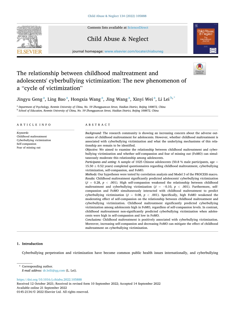 Keywords:Childhood maltreatment; Cyberbullying victimization; Self-compassion; Fear of missing out